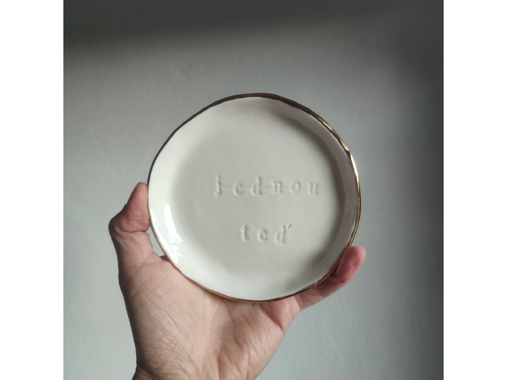 Mini talířek z bělostného porcelánu. Okraj zlacený pravým zlatem.
